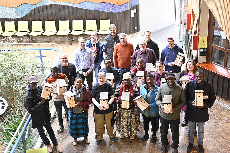 Das Team der Schreinerei hatte für die Gäste aus Tansania die Einzelteile der Nistkästen vorbereitet. Nach einer Besichtigung der Orthopädie-Schuhtechnik wurden die mit dem Einflugloch versehenen Brettchen mithilfe eines Lasers beschriftet. Mit dem Gerät, mit dem sonst Kundendaten auf Maßeinlagen geschrieben werden, schuf man eine einzigartige Erinnerung an den Austausch. Anschließend nagelten und schraubten die Gäste in der Schreinerei der WfbM die Einzelteile zusammen. Die fertigen Nistkästen sollen im Bereich des Dekanats Nassauer Land aufgehängt werden und machen dank ihrer dauerhaften Beschriftung auf das Partnerschaftsprojekt aufmerksam.