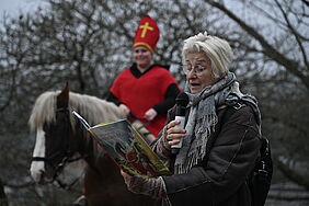 Ganz klein fing der Martinsumzug auf dem Lahnberg bei den Wohnhäusern der Stiftung Scheuern an. Begleitet wurde der Umzug wieder einmal von Mikado. Michelle Hoffmann ritt als Sankt Martin das treue Pferd. An mehreren Stationen entlang der Strecke erzählte Franziska Klepper von Martin von Tours und der Bedeutung des Teilens. Sie schloss mit dem Friedensgebet des Franz von Assisi.