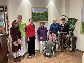 Die beiden hatten ein weiteres Geschenk im Gepäck. Sie brachten ein neues Bild mit, das den Wohnzimmerbereich des Stationären Hospiz Rhein-Lahn ziert. Das Schmuckstück entstand ebenfalls in der Tagesförderstätte und zeigt die Burg Nassau und das schöne Mühlbachtal. Leiterin Hanne Benz und ihr Team nahmen das Werk dankbar in Empfang.