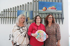 Isabelle Wigand, die als Überraschungsgast dazukam, ist Bewohnerin des Alten Hauses und stellte eines ihrer Erstlingswerke vor – ein wunderschönes buntes Bild, das zudem durch seine ovale Form besticht. „Isabelle hat in der Berufsbildung entdeckt, dass sie Lust zum Malen hat, und ist ein echter Rohdiamant“, sagte Maria Metzger, die die Ausstellungen in der Stiftung Scheuern organisiert. „Sie macht auch beim Landeswettbewerb ‚Kreativ und Inklusiv‘ mit und wird weiterhin malen und versuchen, auszustellen.“