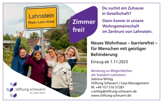Interessierte können sich bei Sabrina Wittig (Casemanagement) unter der Tel. +49 157 516 572 81 oder per E-Mail an s.wittig(at)stiftung-scheuern.de melden. Alternativ können sich Interessierte auch bei Sylvia Saggese (Einrichtungsleitung Lahnstein | Montabaur) unter der Tel. +49 176 174 456 93 oder per E-Mail an s.saggese(at)stiftung-scheuern.de melden.