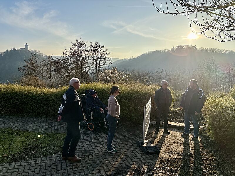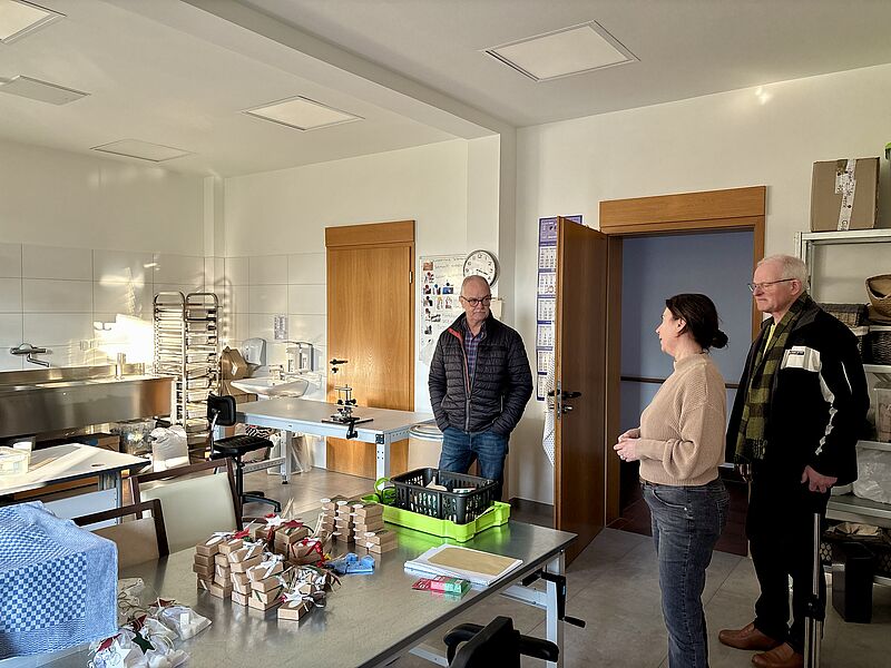 Fachlich kamen Markus Clos und Sonja Behnke zu Wort hinsichtlich des pädagogischen Werts und der Teilhabemöglichkeiten beim Imkern. Clos und Behnke zeigten den Spendenüberbringern die Baustelle, an der mit der Schaffung eines gepflasterten, barrierefreien Platzes an der Sonne erste Schritte für die Installation der ersten sieben Bienenstöcke zum Projektstart im Frühjahr getan werden. Sie erläuterten die Pläne für den umliegenden Garten und die Nahrungsgrundlage für die Bienen in der näheren und ferneren Umgebung. Auch Schutzausrüstung für die direkte Arbeit am Bienenstock werde angeschafft für alle Projektteilnehmer, also auch in einer rollstuhlgerechten Ausführung, damit alle bis zu den Stöcken kommen können. Zum Schluss informierten sich Zaun und Grein bei einer Führung mit Sonja Behnke durch die weiteren Räume der Rehagruppe über die arbeitspädagogischen Angebote und die in den Alltag integrierten Therapiemöglichkeiten.
