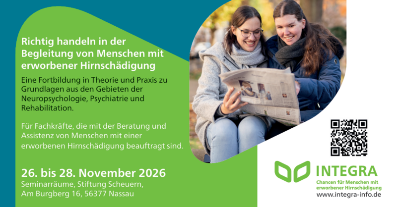 Fachkräften, die im Beruf mit der Begleitung von Menschen mit erworbener Hirnschädigung beauftragt sind, aber noch neu auf dem Gebiet, bietet die Fortbildung in Theorie und Praxis Grundlagen aus den Gebieten der Neuropsychologie, Psychiatrie und Rehabilitation. Die Grundlagenschulung findet statt vom 26. bis 28. November 2026 in Nassau. Interessierte Laien können auch gerne teilnehmen. Anmeldeschluss 31.10.2026.