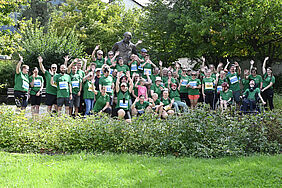 Die Ausgabe der Startnummern erfolgte am Freibad. Anschließend lief die Gruppe gemeinsam zum Freiherr-Vom-Stein-Denkmal im Park, wo alle für ein Gruppenfoto bereitstanden. Ein beeindruckendes Bild, das die vielen Menschen aus der Stiftung Scheuern abgaben.