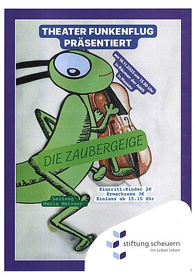 „Die Zaubergeige“ ist an die bekannte Fabel „Die Grille und der Maulwurf“ angelehnt. Maria Metzger, die Leiterin der Funkenflieger, hat sie jedoch, zugeschnitten auf die Bedürfnisse der Theatergruppe, umgeschrieben. Als Schauspieler wirken Elke Breng, Christian Döllken, Marion Hartwig, Horst Mischel, Walter Moll und Michael Todsen mit. Neben Maria Metzger betreuen als Mitarbeitende der Stiftung Scheuern Traude Ackermann, Walter Fatkin, Iris Friedrich und Alexandra Klaiber die Aufführung.